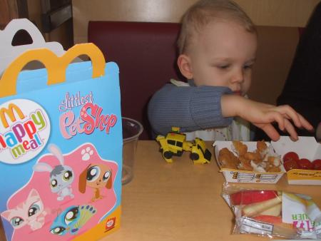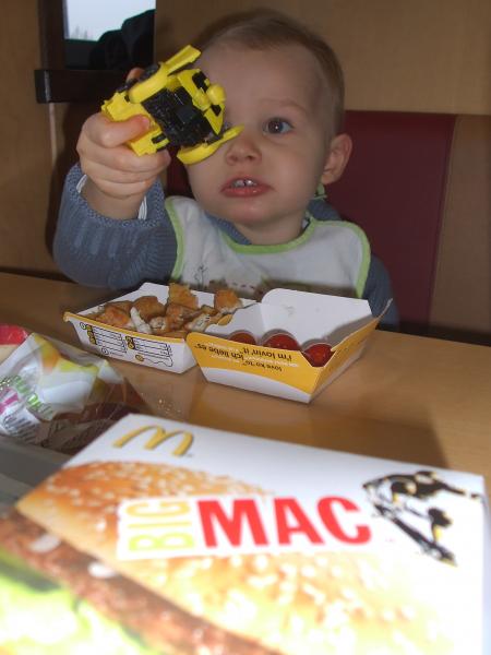 J'ai pris un Happy meal avec des tomates, des nuggets, de l'eau et des fruits. Et en plus j'ai eu un robot transformable en voiture, trop cool!!
