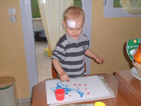 Des traits bleus et des points rouges, ça suffira pour aujourd'hui. La prochaine fois j'essaierai au pinceau parce que les doigts sales, ça ne me plaît pas trop!