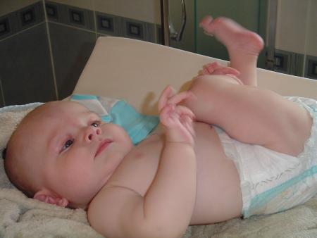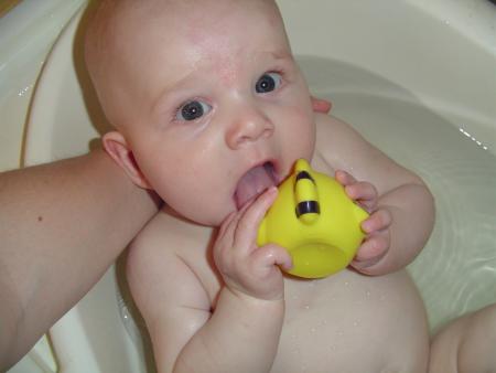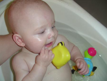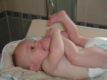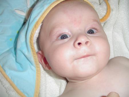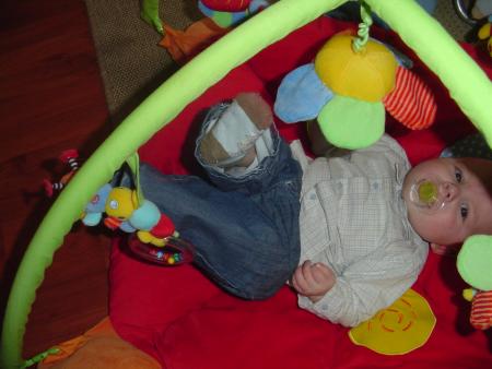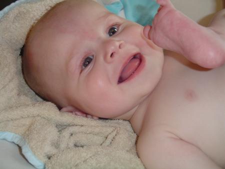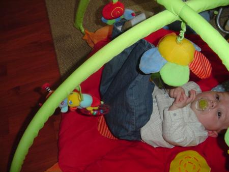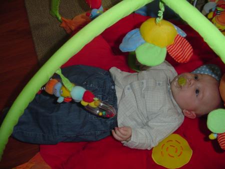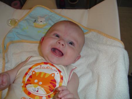 Cet après-midi, vers 13h15, j'ai bien cassé les oreilles de papy et mamie à Boulay! C'est parce que ma 1ère dent est arrivée, en bas à ma droite. On ne la voit pas trop bien sur la photo, pourtant j'ouvre bien la bouche...